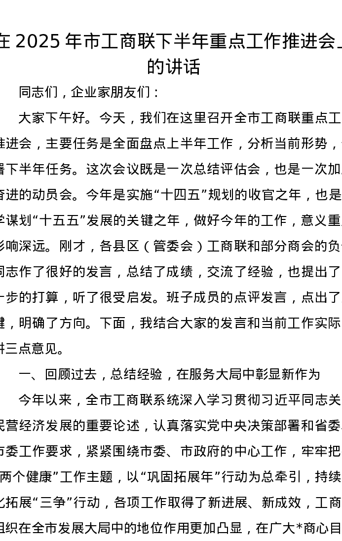 在2025年市工商联下半年重点工作推进会上的讲话