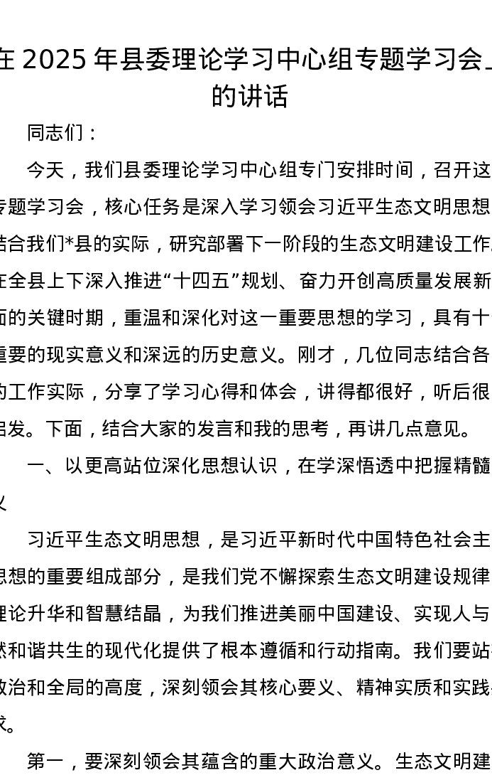 在2025年县委理论学习中心组专题学习会上的讲话