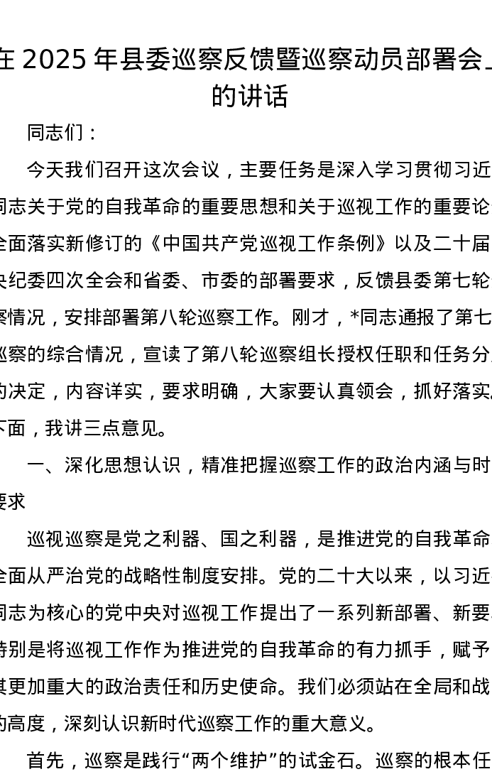 在2025年县委巡察反馈暨巡察动员部署会上的讲话