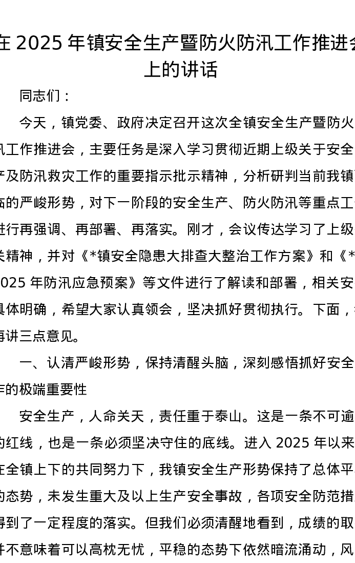 在2025年镇安全生产暨防火防汛工作推进会上的讲话