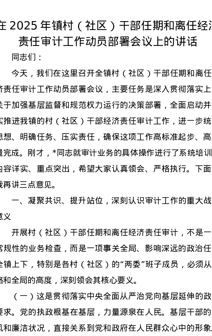 在2025年镇村(社区)干部任期和离任经济责任审计工作动员部署会议上的讲话