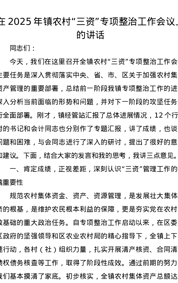在2025年镇农村“三资”专项整治工作会议上的讲话