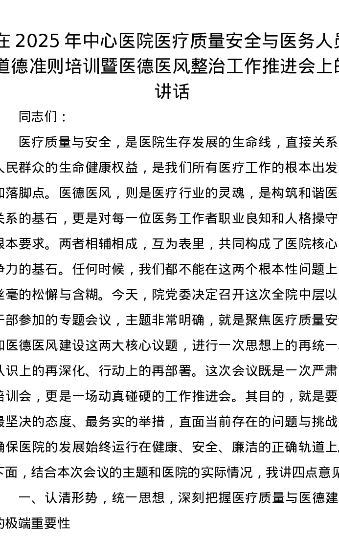 在2025年中心医院医疗质量安全与医务人员道德准则培训暨医德医风整治工作推进会上的讲话