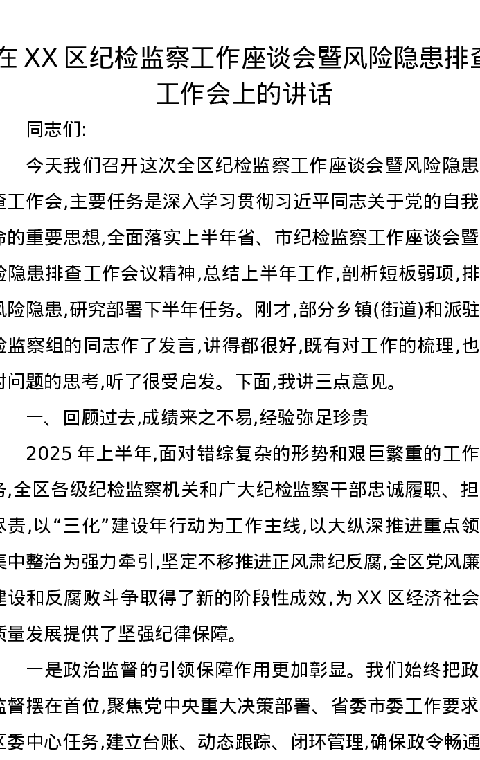 在XX区纪检监察工作座谈会暨风险隐患排查工作会上的讲话