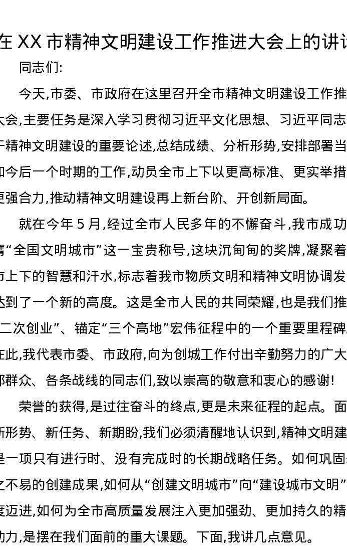 在XX市精神文明建设工作推进大会上的讲话