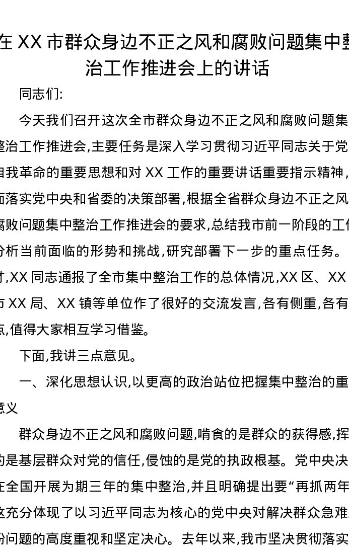 在XX市群众身边不正之风和腐败问题集中整治工作推进会上的讲话2