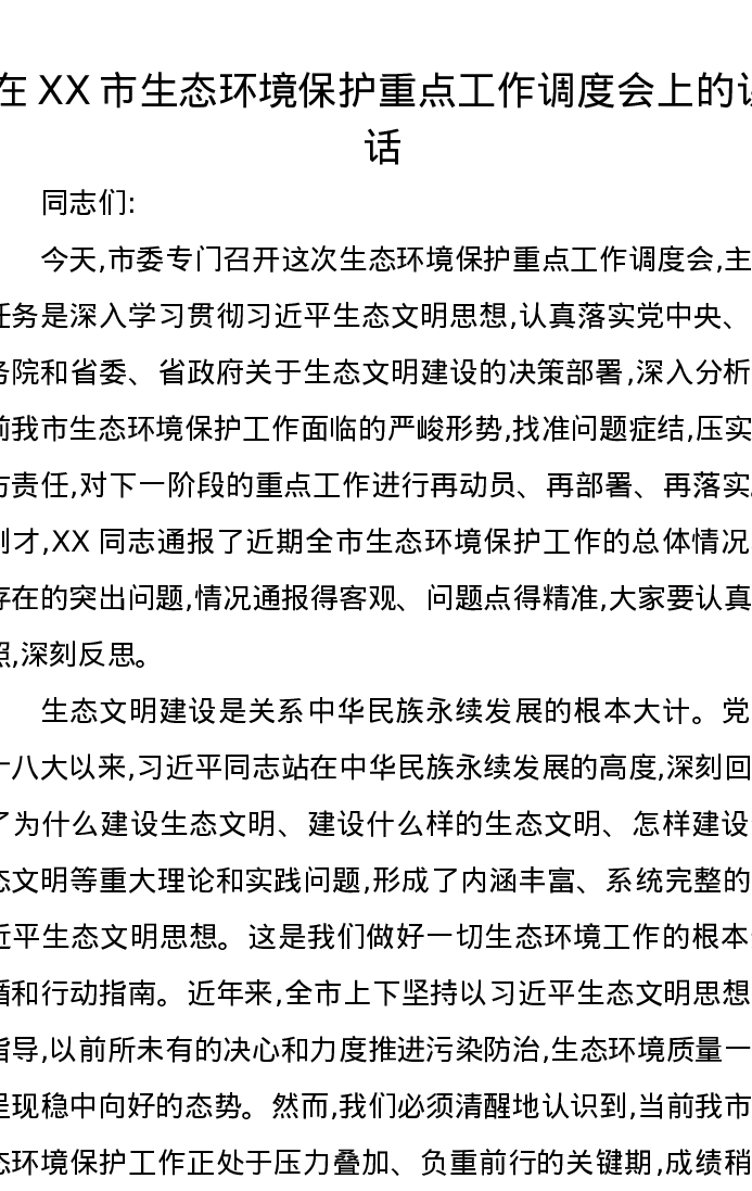 在XX市生态环境保护重点工作调度会上的讲话