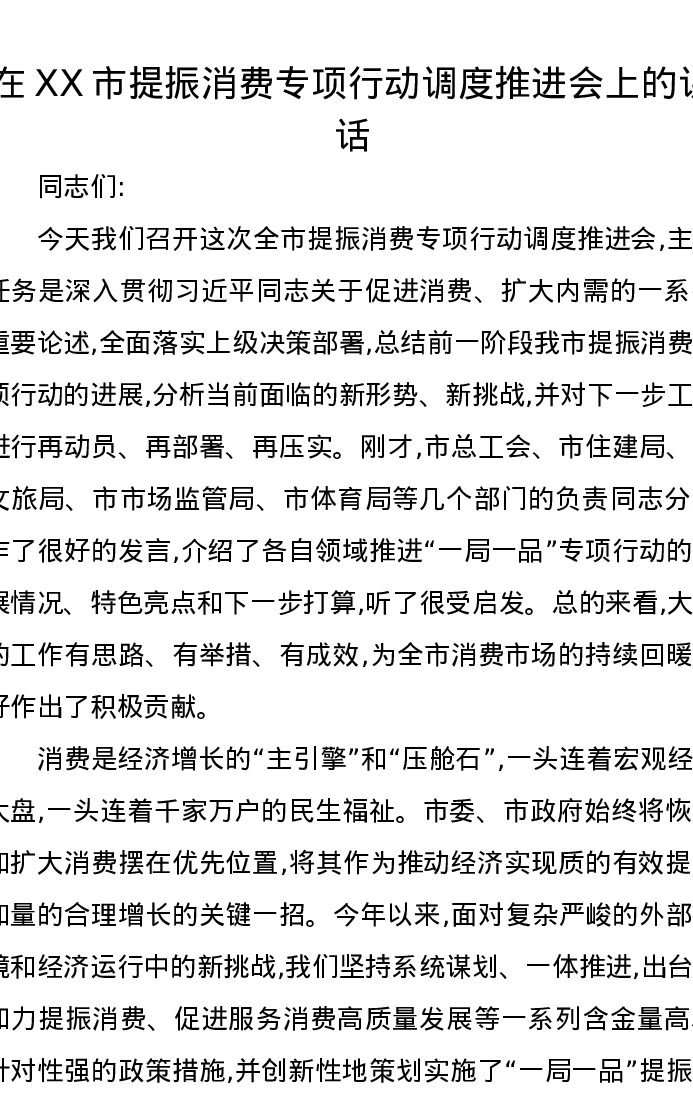 在XX市提振消费专项行动调度推进会上的讲话