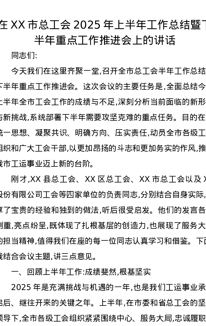 在XX市总工会2025年上半年工作总结暨下半年重点工作推进会上的讲话