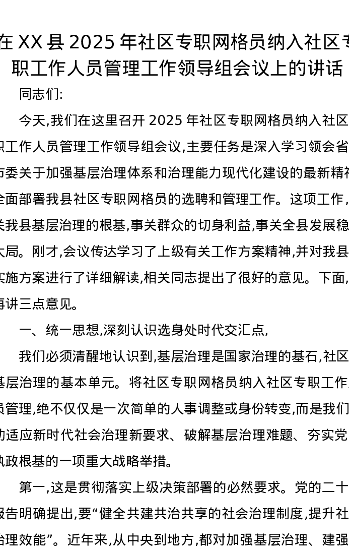 在XX县2025年社区专职网格员纳入社区专职工作人员管理工作领导组会议上的讲话