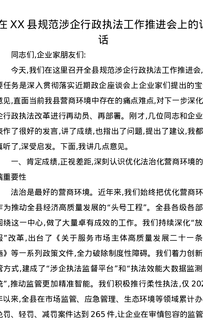 在XX县规范涉企行政执法工作推进会上的讲话
