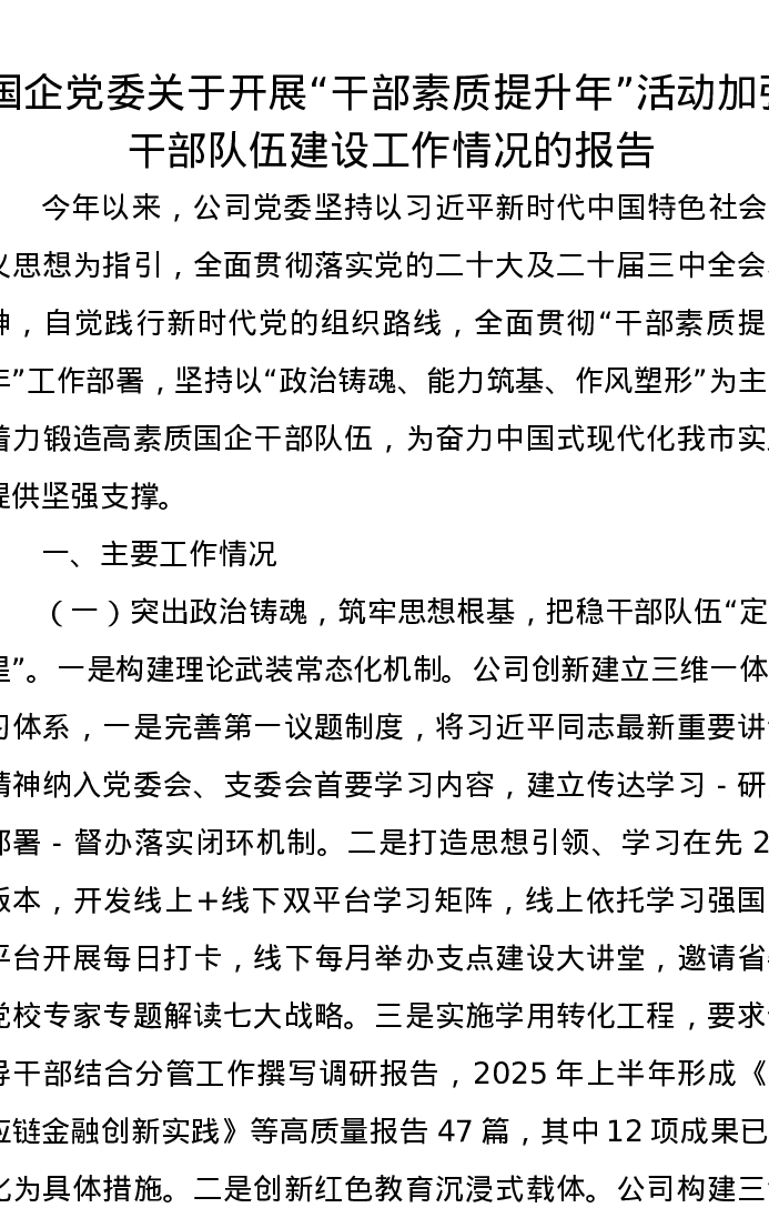国企党委关于开展“干部素质提升年”活动加强干部队伍建设工作情况的报告
