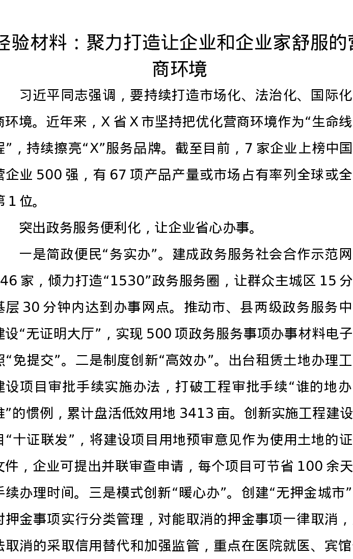 经验材料:聚力打造让企业和企业家舒服的营商环境
