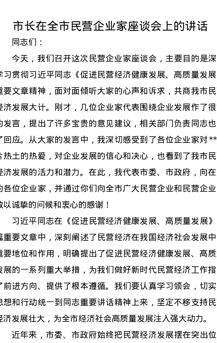 市长在全市民营企业家座谈会上的讲话