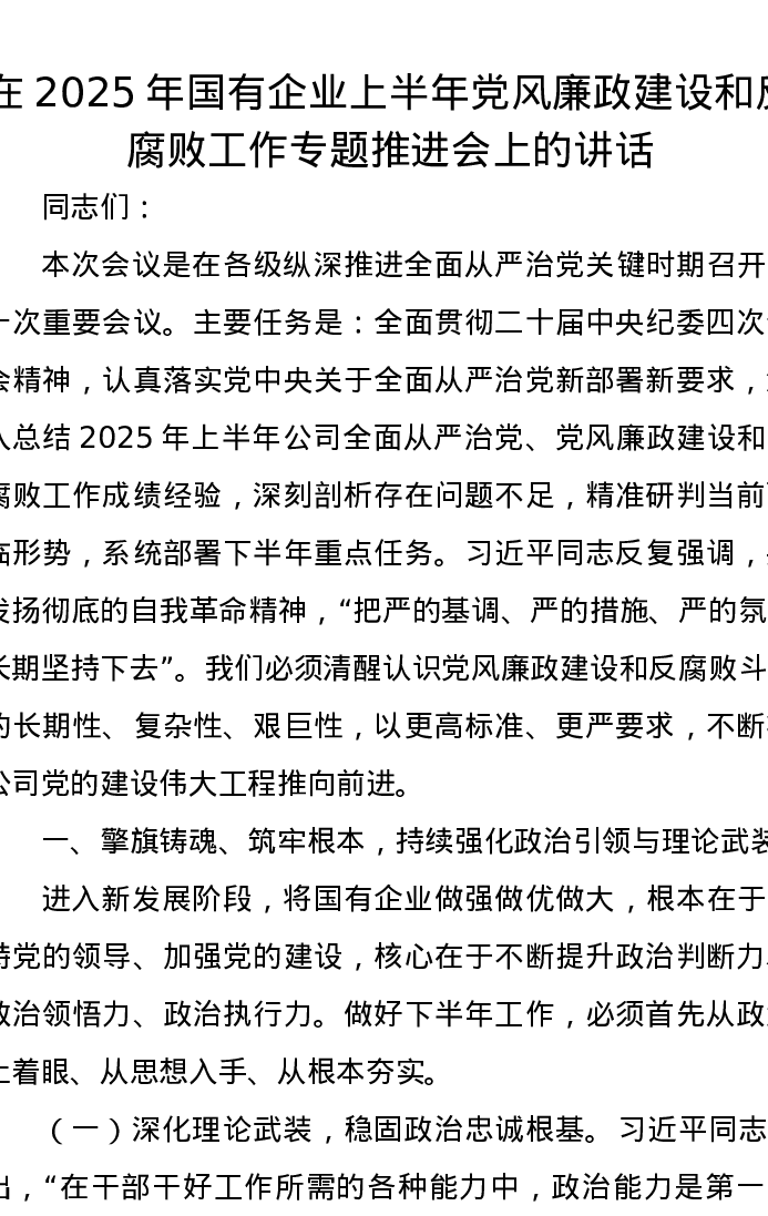 在2025年国有企业上半年党风廉政建设和反腐败工作专题推进会上的讲话