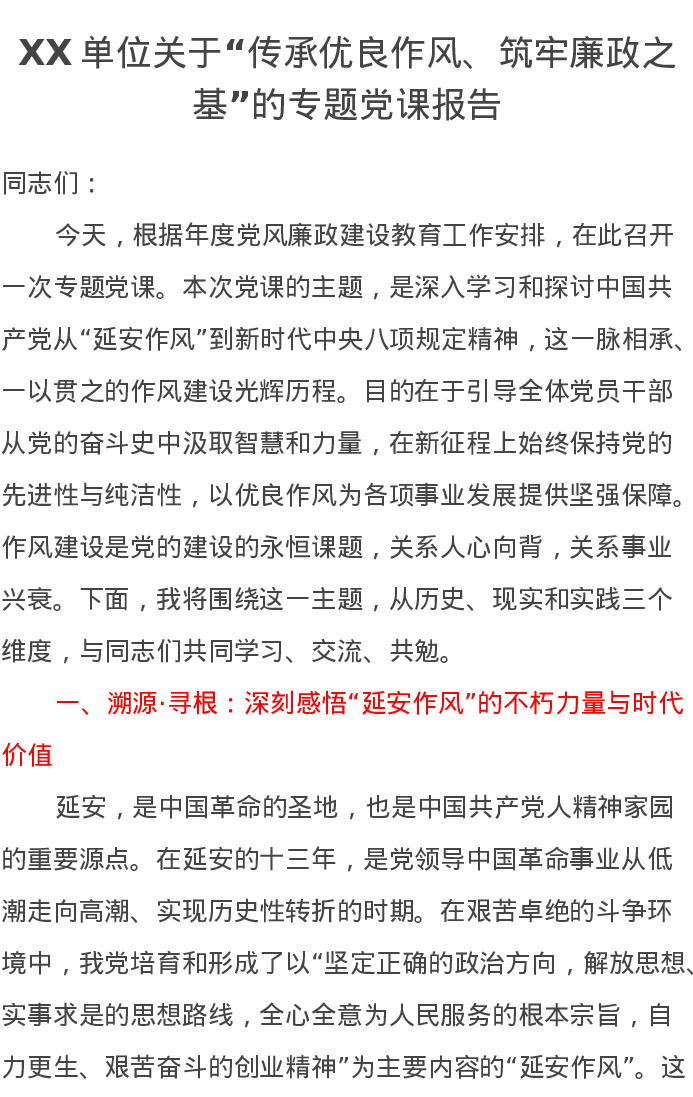 XX单位关于“传承优良作风、筑牢廉政之基”的专题党课报告