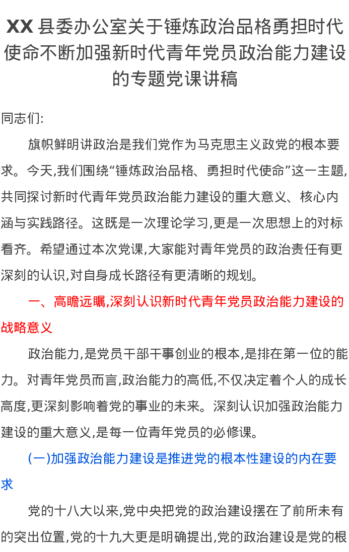 XX县委办公室关于锤炼政治品格勇担时代使命不断加强新时代青年党员政治能力建设的专题党课讲稿