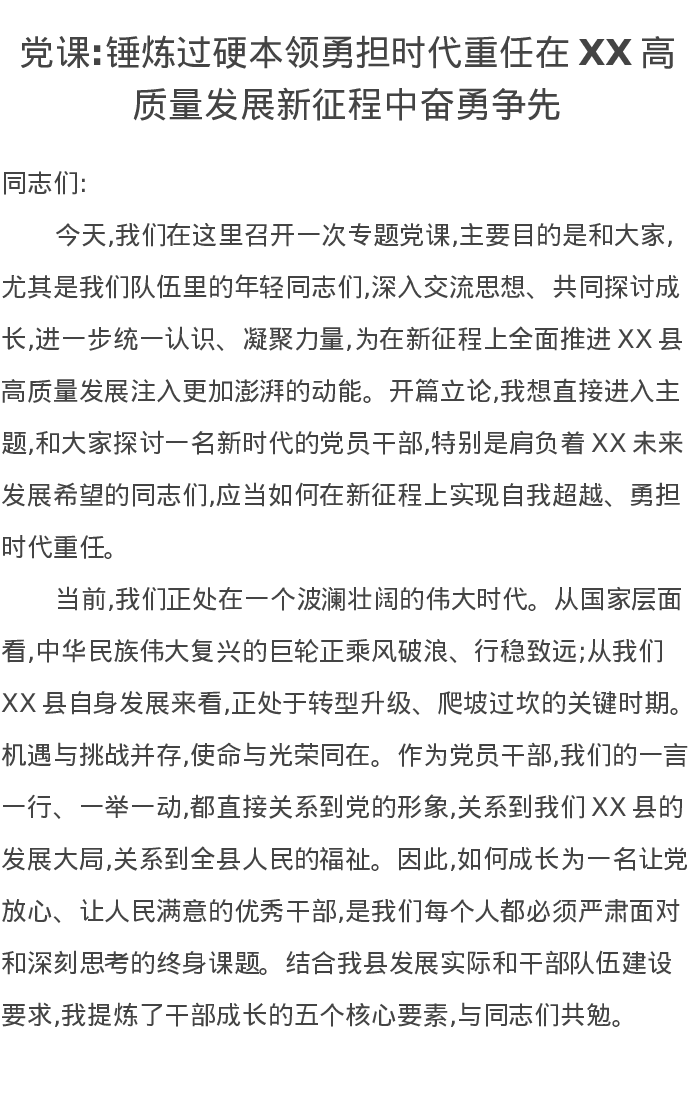 党课讲稿:锤炼过硬本领勇担时代重任在XX高质量发展新征程中奋勇争先