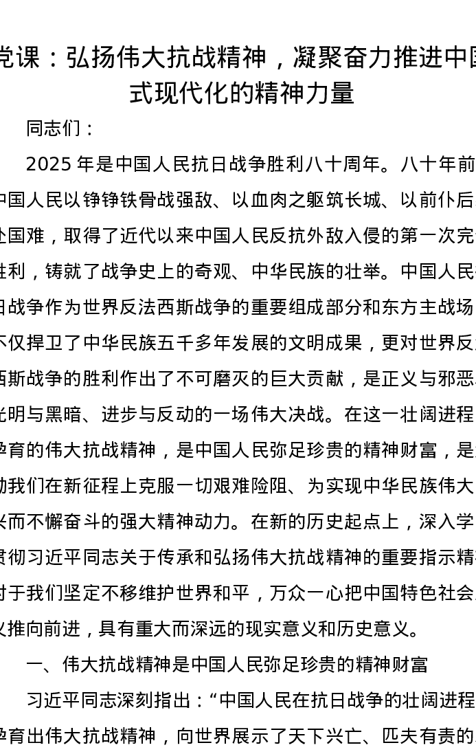 党课讲稿:弘扬伟大抗战精神,凝聚奋力推进中国式现代化的精神力量