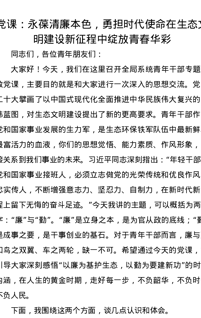 党课讲稿:永葆清廉本色,勇担时代使命在生态文明建设新征程中绽放青春华彩