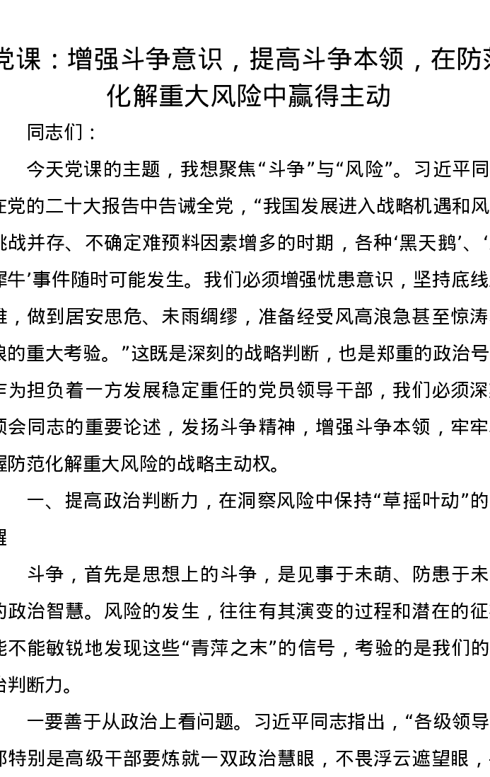 党课讲稿:增强斗争意识,提高斗争本领,在防范化解重大风险中赢得主动