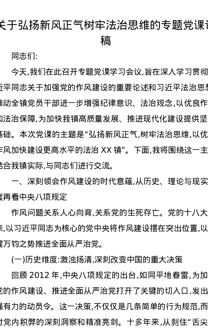 关于弘扬新风正气树牢法治思维的专题党课讲稿