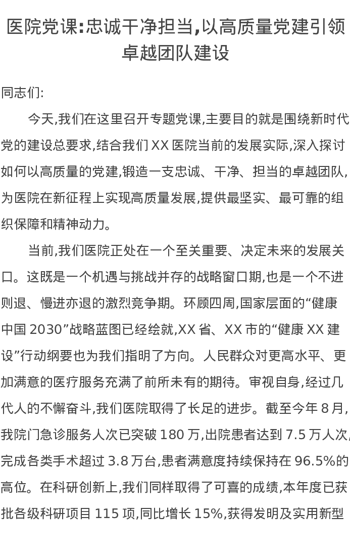医院党课讲稿:忠诚干净担当,以高质量党建引领卓越团队建设