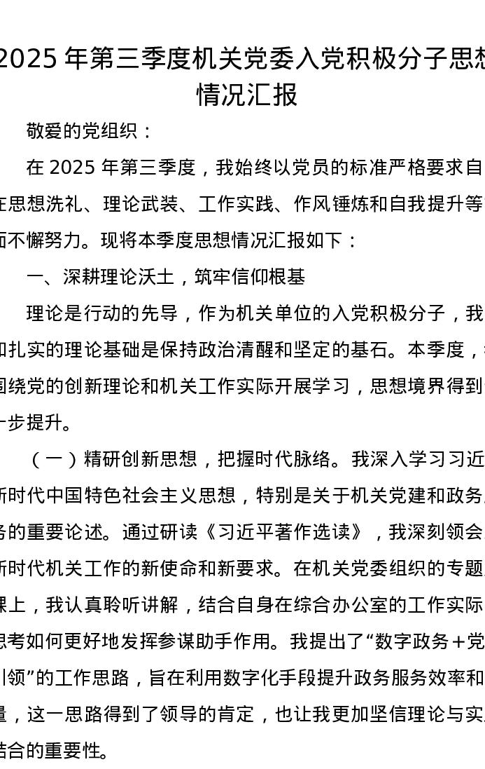 2025年第三季度机关党委入党积极分子思想情况汇报