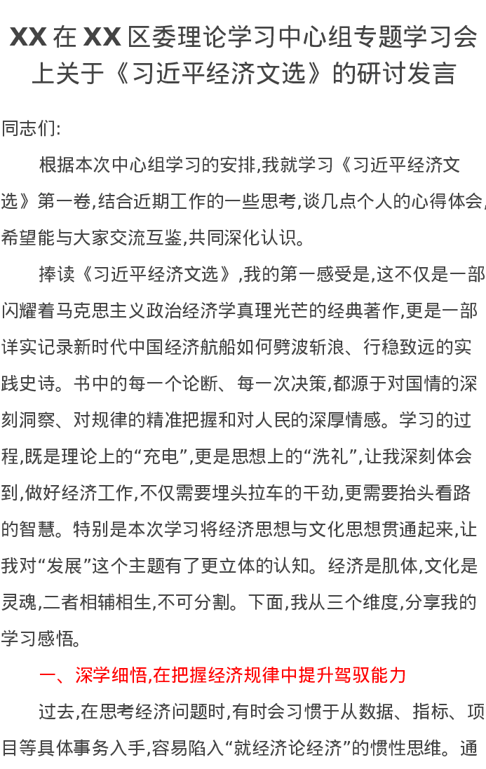 XX在XX区委理论学习中心组专题学习会上关于《习近平经济文选》的研讨发言