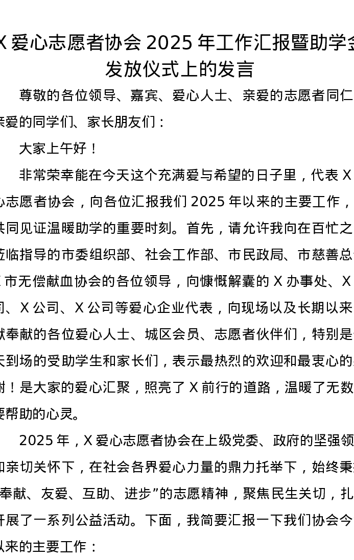 X爱心志愿者协会2025年工作汇报暨助学金发放仪式上的发言