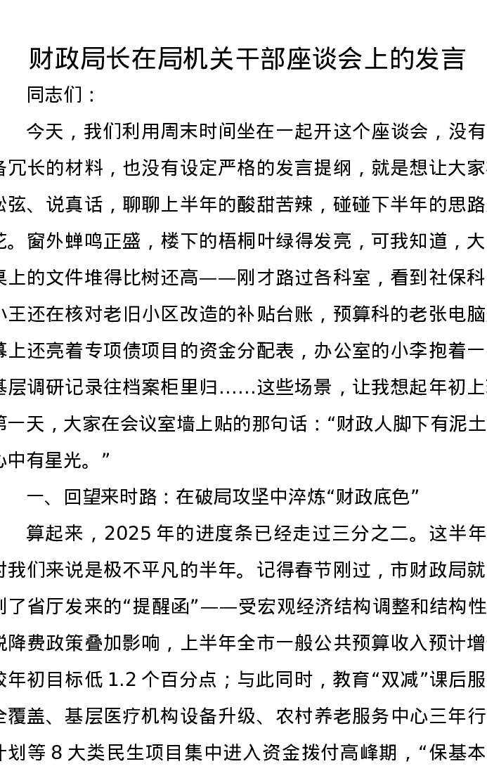 财政局长在局机关干部座谈会上的发言