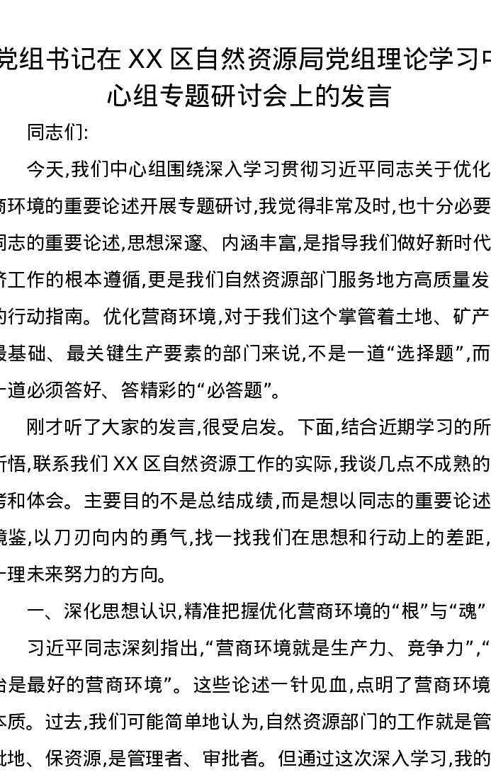 党组书记在XX区自然资源局党组理论学习中心组专题研讨会上的发言