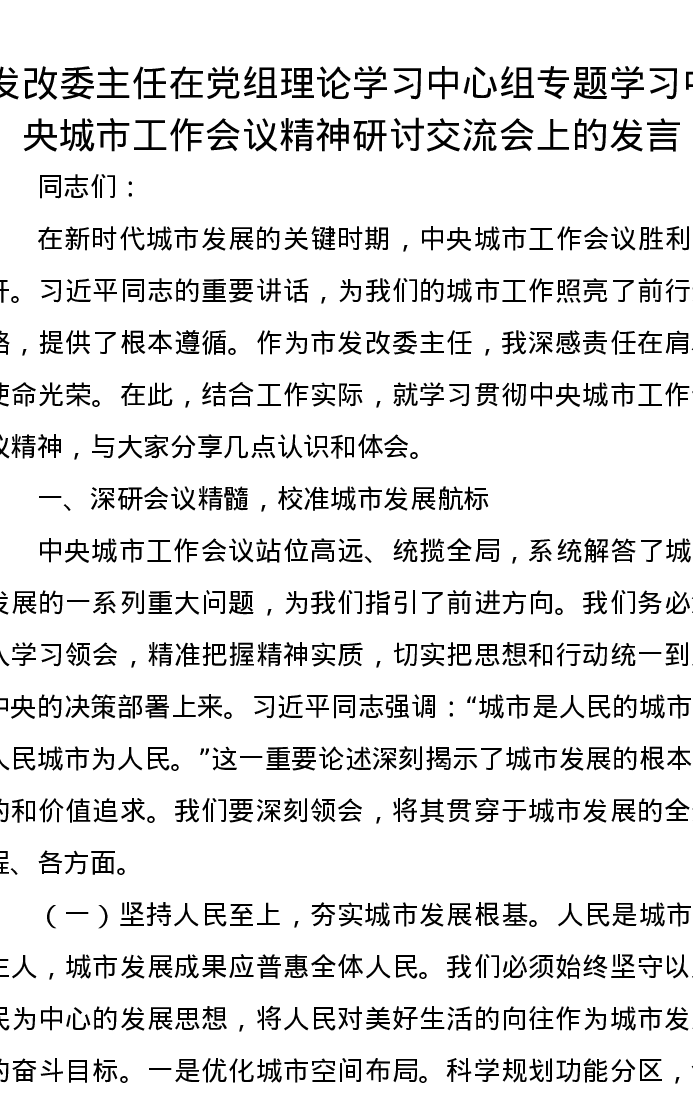 发改委主任在党组理论学习中心组专题学习中央城市工作会议精神研讨交流会上的发言
