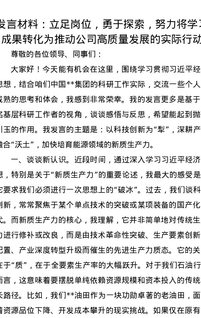 发言材料:立足岗位,勇于探索,努力将学习成果转化为推动公司高质量发展的实际行动