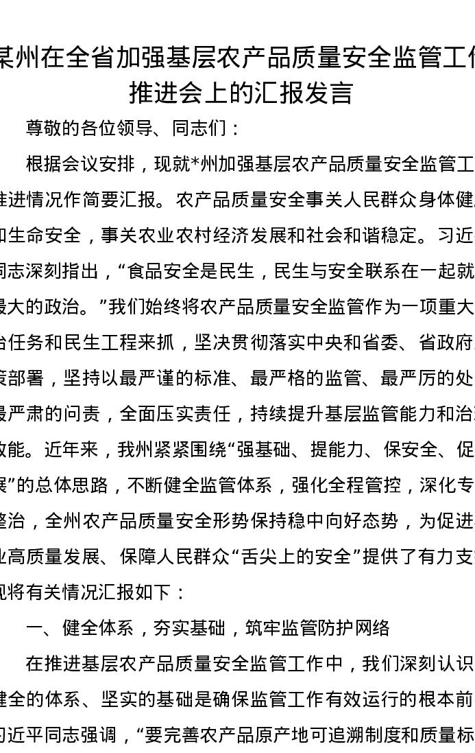 某州在全省加强基层农产品质量安全监管工作推进会上的汇报发言