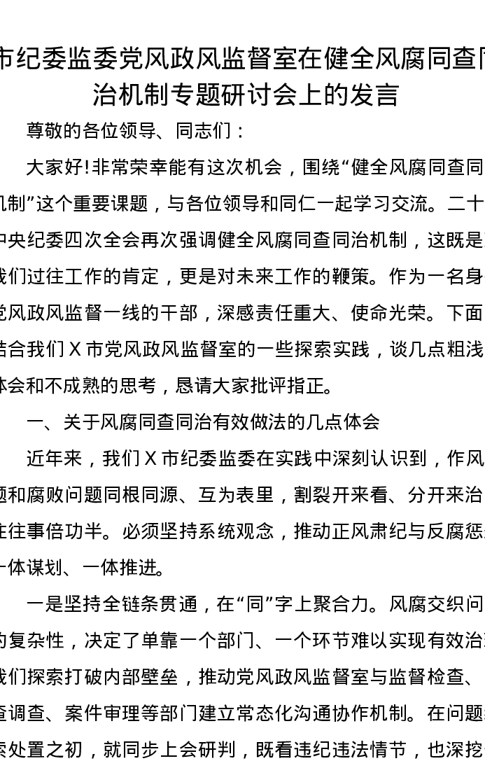 市纪委监委党风政风监督室在健全风腐同查同治机制专题研讨会上的发言