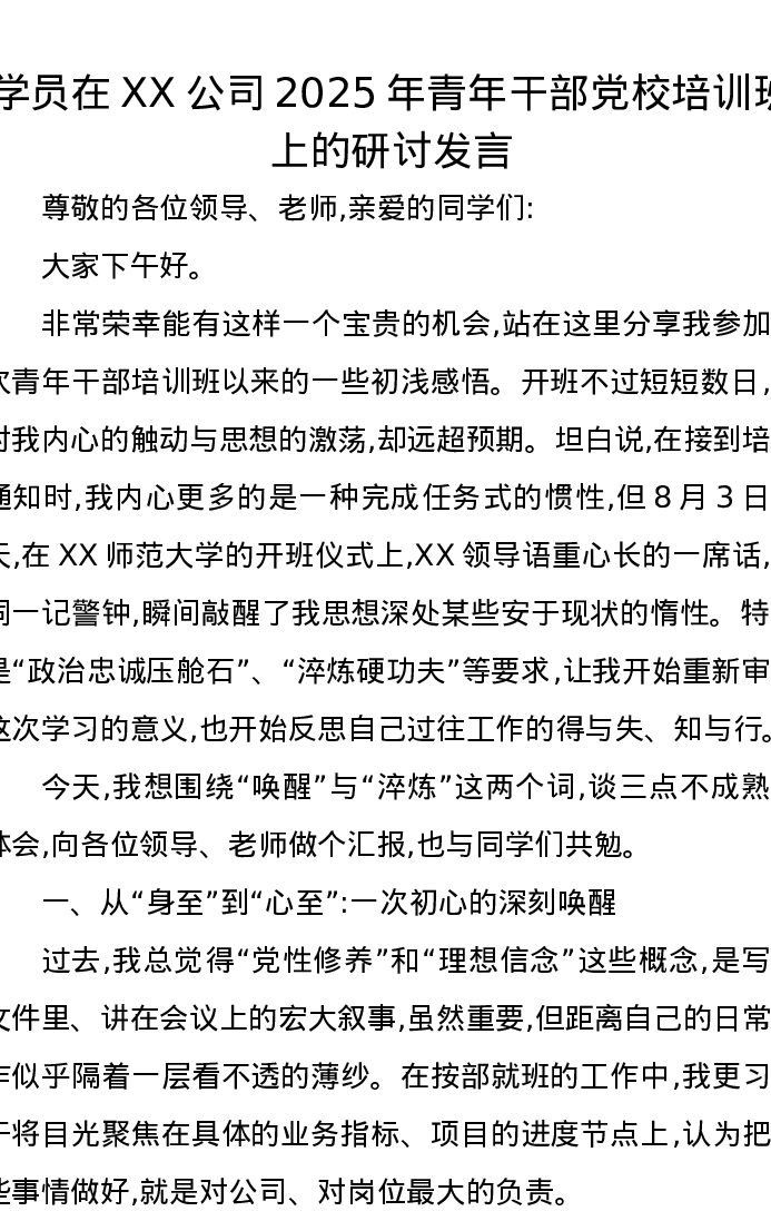 学员在XX公司2025年青年干部党校培训班上的研讨发言