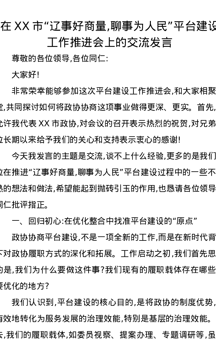 在XX市“辽事好商量,聊事为人民”平台建设工作推进会上的交流发言