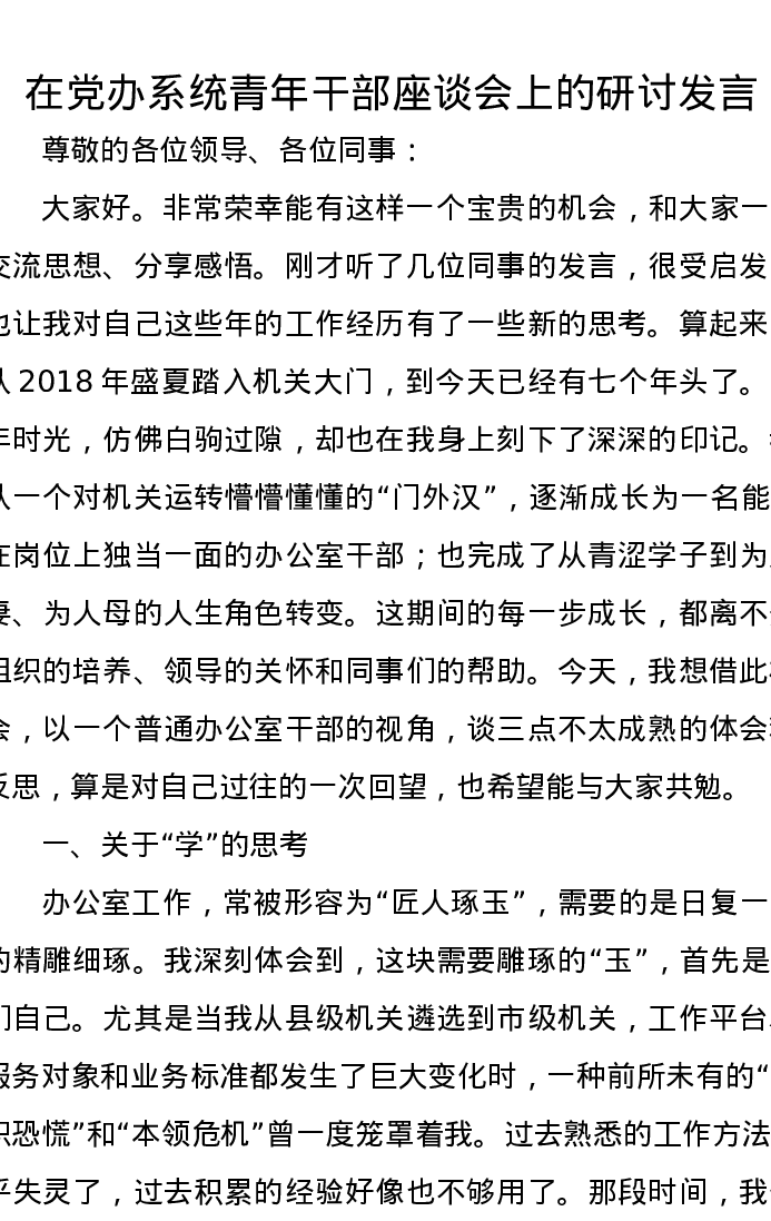 在党办系统青年干部座谈会上的研讨发言