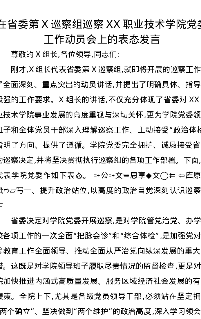 在省委第X巡察组巡察XX职业技术学院党委工作动员会上的表态发言