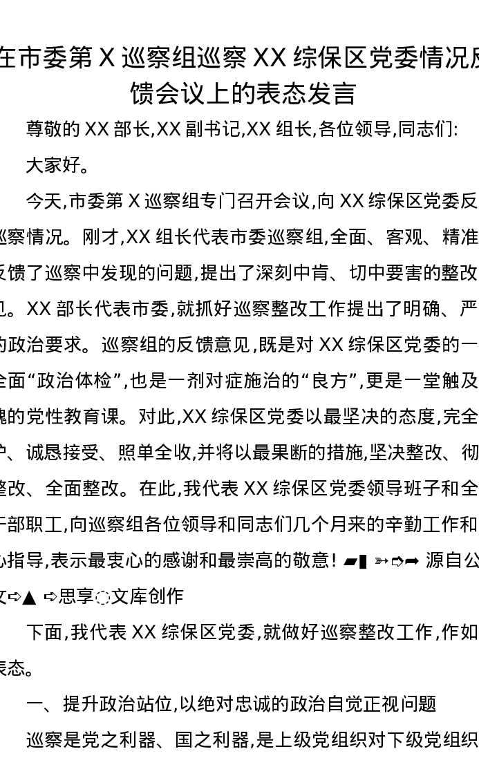 在市委第X巡察组巡察XX综保区党委情况反馈会议上的表态发言