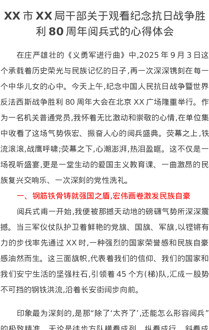 XX市XX局干部关于观看纪念抗日战争胜利80周年阅兵式的心得体会