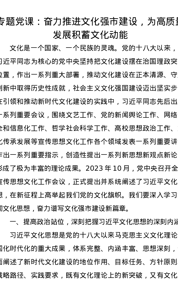 党课讲稿:奋力推进文化强市建设,为高质量发展积蓄文化动能