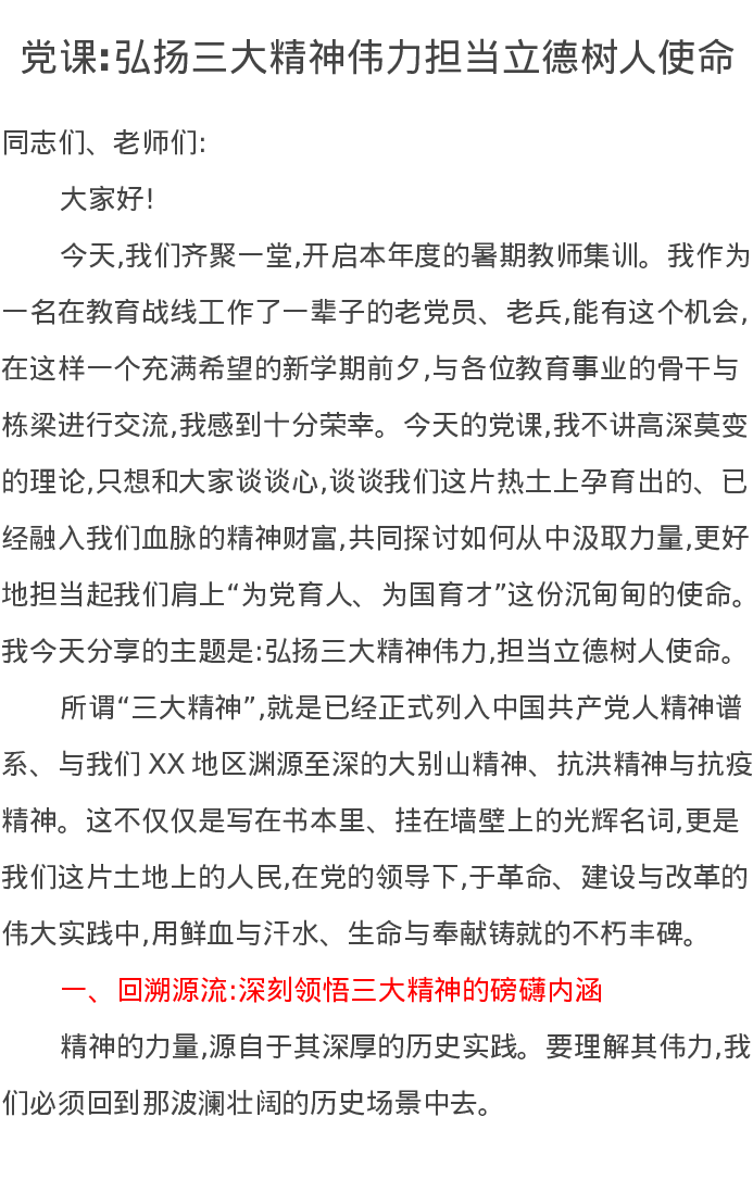 党课讲稿:弘扬三大精神伟力担当立德树人使命