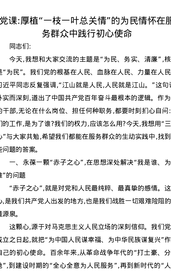 党课讲稿:厚植“一枝一叶总关情”的为民情怀在服务群众中践行初心使命