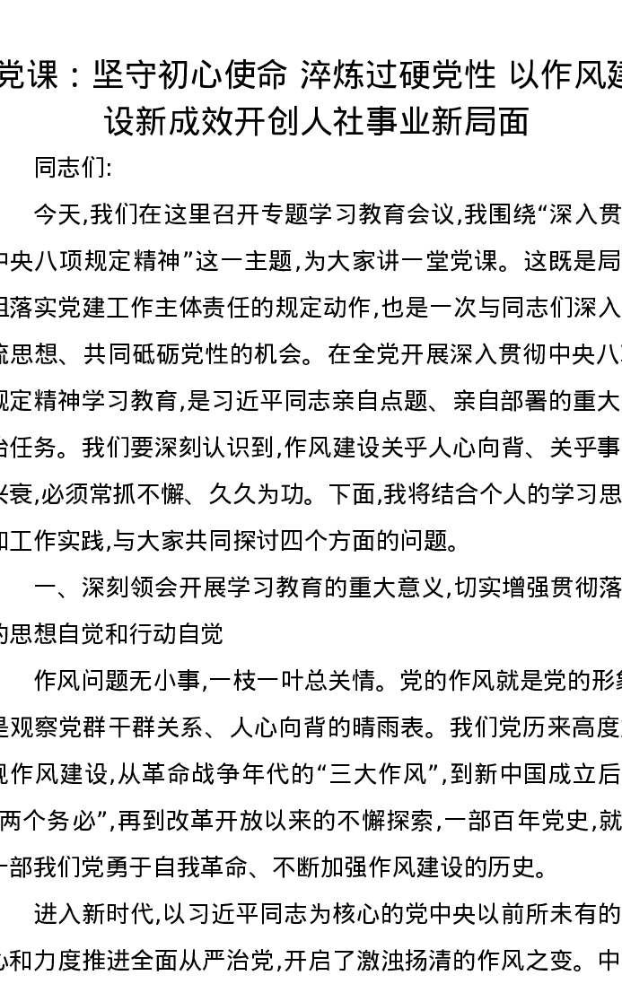党课讲稿:坚守初心使命 淬炼过硬党性 以作风建设新成效开创人社事业新局面