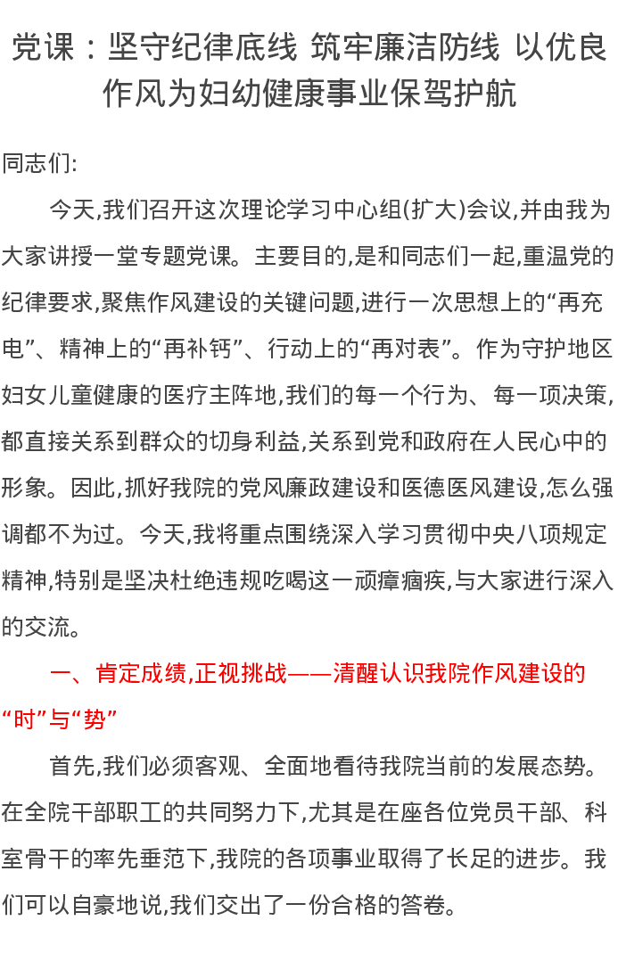 党课讲稿:坚守纪律底线 筑牢廉洁防线 以优良作风为妇幼健康事业保驾护航