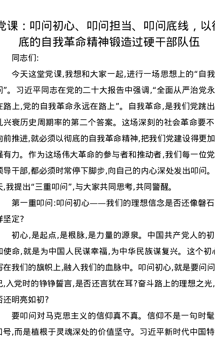 党课讲稿:叩问初心、叩问担当、叩问底线,以彻底的自我革命精神锻造过硬干部队伍