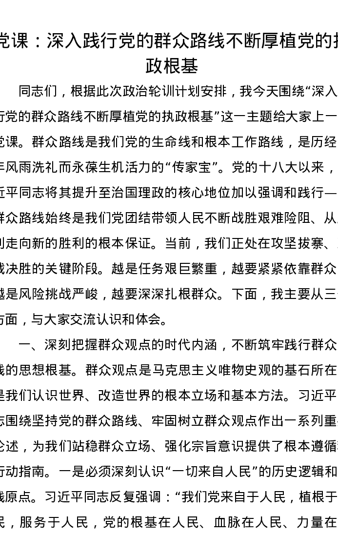 党课讲稿:深入践行党的群众路线 不断厚植党的执政根基