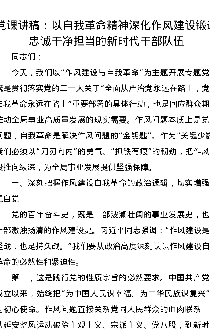 党课讲稿:以自我革命精神深化作风建设 锻造忠诚干净担当的新时代干部队伍